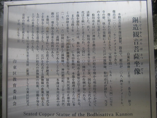 都営地下鉄大江戸線(浅草線側からは少し離れています)の蔵前駅からは徒歩すぐの距離にあるお寺で、本堂自体は現代風の感じなので、あまり魅力は感じない風情でしたが、歴史的には結構有名だったお寺だったようで、昔の絵画に描かれている様子なども写真付きで解説されていました。著名人のお墓の解説などもありましたが、墓地に行ってもよく場所が判りませんでした…。