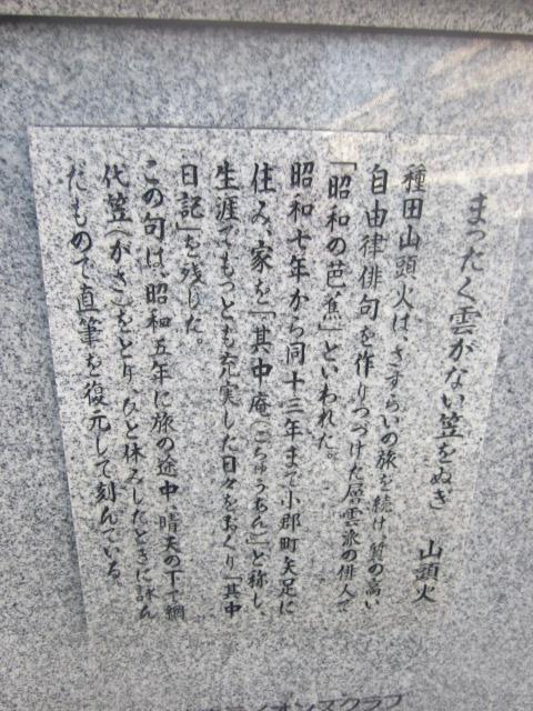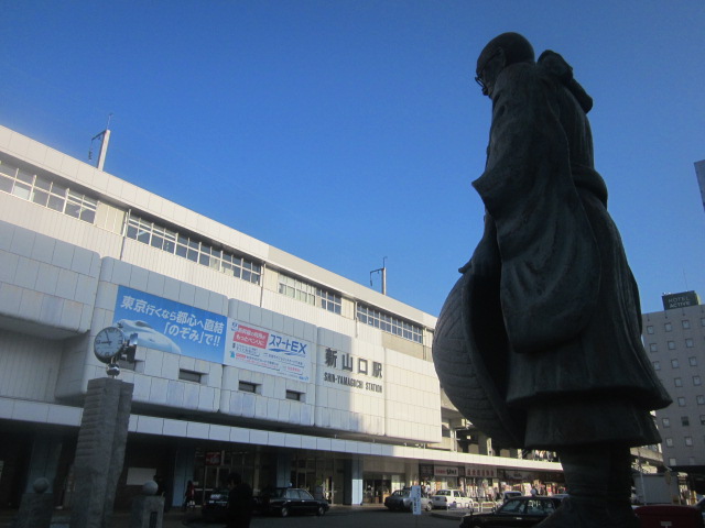 JR新山口駅の新幹線改札口を降りてすぐの駅前広場脇にひっそりと建っているのがこちらの像です。私は在来線側から観光案内所を見に行ったついでに訪問しましたが、正直、新山口駅では在来線改札と新幹線改札が物凄く離れていますので、わざわざ見に行くほどの像でもないかなという印象でした。勿論、山頭火ファンの方にはその限りではないかと思いますが…。逆に、在来線側にはあまり見所らしき像や碑などは見当たらず、やっぱり新山口駅は基本的には新幹線利用者向けの駅なのだろうなと、新幹線には殆ど乗らない自分は寂しい気持ちになりました。