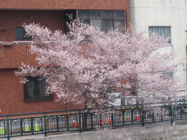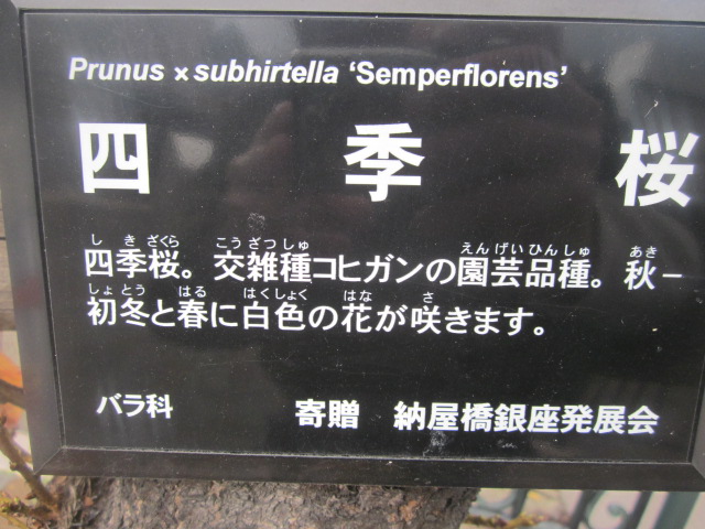 名古屋駅から徒歩10分程度の距離にある広小路通り沿いの納屋橋は、「納屋橋饅頭」などでもお馴染みの、堀川に架かる名古屋を代表する歴史的な橋の一つですが、ここから南側、一本向こうの天王崎橋に至るまでの歩道沿いに、四季桜と呼ばれる、12月に開花する桜の木が何本かあります。