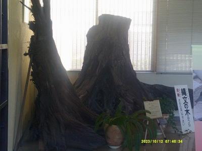 今回は早朝に御経塚遺跡を訪問したため、まだここが開館前の時間帯で、展示室内に入ることは出来ませんでしたが、向かいの史跡公園を散策中に、地元の方とお話する機会があり、ここの歴史館の入口の縄文の木なら、閉まってても入口の隙間から見えることを教えてもらい、ちょっと覗きに行ってみました。