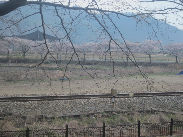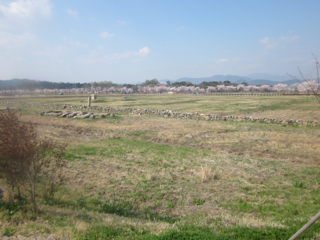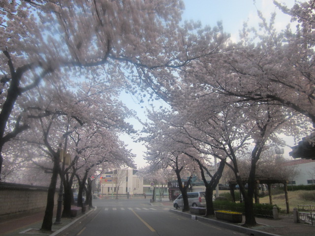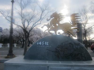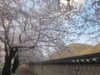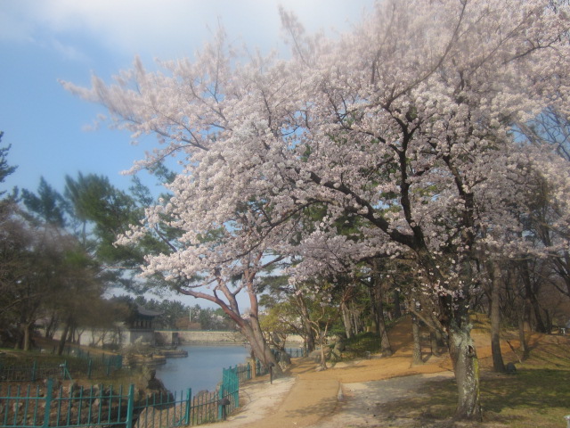 慶州の市街地にある観光地の一つで、近年ここの東側に並ぶ桜並木が、開花時期には人気スポットになっています。私は今回、朝と夕方に二度、この桜並木を眺めてみました。