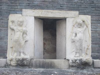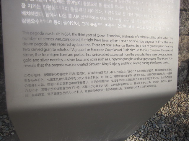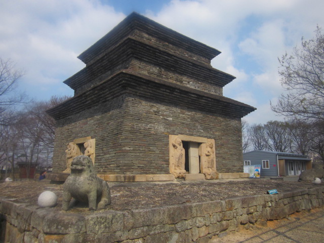 皇龍寺址の一連の史跡エリアの北方に佇む小さなお寺ですが、ここはそのコンパクトな仕様の中に、国宝の三層石塔を始めとした貴重な史跡が色々と並んでいて、非常に見応えがあるお寺だと思います。三層石塔に関しては、各方向の下部に設置された石門脇の仁王様のレリーフや、隅に配置された守護神としての獅子やオットセイの像など、細部も非常に見応えがあって、うっとりとしてしまいました。