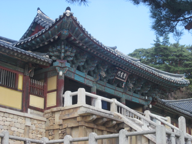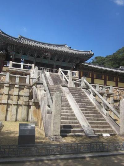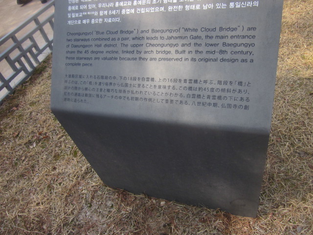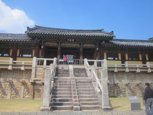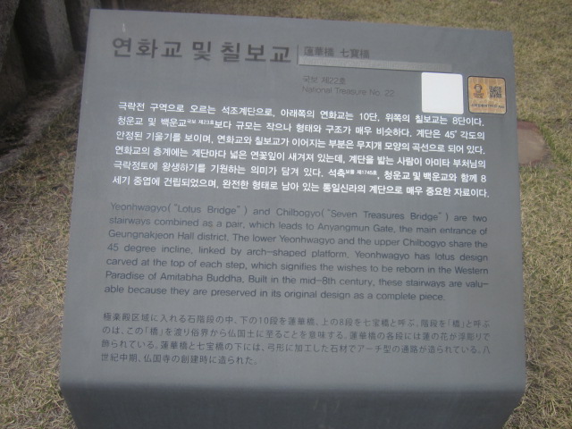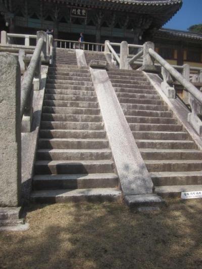 仏国寺には全部で6つの国宝がありますが、ここもその一つで、隣にある青雲橋・白雲橋と共に、創建当時の建造物として大切にされていて、現在は通常の観光客は立ち入り禁止となっています。段数が少ない(8段と10段)ので、青雲橋・白雲橋(16段・18段)と比較すると迫力には欠ける印象ですが、国宝の指定番号としては微妙にこちらの方が先(22号・青雲橋・白雲橋は23号)です。