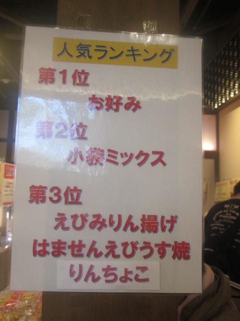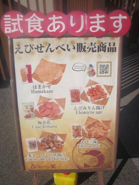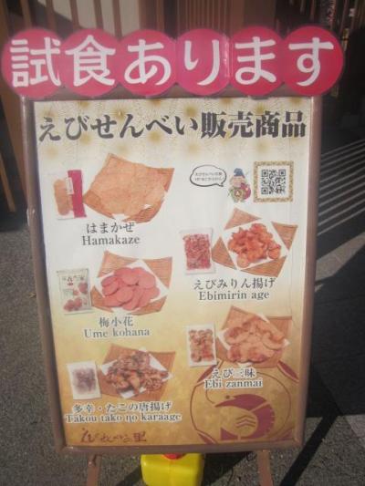 他のえびせんべいの里店舗の比較で言うと、ここは少し通路が狭めなので、両側に試食が並んでいるエリアなどはすれ違いに少しストレスを感じることもあります。人気商品やお勧め商品のポップなども随所に掲示されていますので、それらを参考にしながら、無難なチョイスをするか、或いは斬新性を狙って新商品・季節限定商品などに手を出してみるか、そんな戦略を考えるのも楽しい店舗です。- 旅行時期