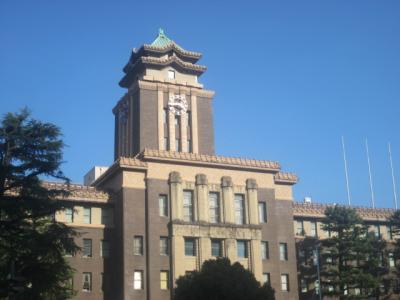 2019年3月現在で、戦後再建された従来のコンクリート製天守閣は閉鎖されていて、今後、戦前の姿の木造天守閣に建て直されることになっていますが、そんな町の市役所は、実は名古屋城のすぐ近くにあって、しかも、頂部には名古屋城と同様、鯱が施されています。