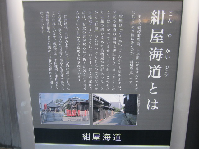 音を聴くだけでは、ずっと”紺屋街道”だと思っていたのですが、正確には”海の道”と表記する昔ながらの道です。元々は船の帆向けの染物商が並んでいたことに由来するそうですが、現代の視点からすると相当狭い道で、車がやって来ると冷や冷やしてしまう程の細さです。ただ、皆さん事情をよくご存じで慣れていらっしゃるので、歩行者がいても、気長に徐行して待っていてくれる心配りが素晴らしいなと思いました。常滑のやきもの散歩道と同じような風情で楽しむと良い道です(常滑ほど長くはないので、すぐに歩き通せるのも、多忙な観光客の方にはよりお勧めできると思います。)