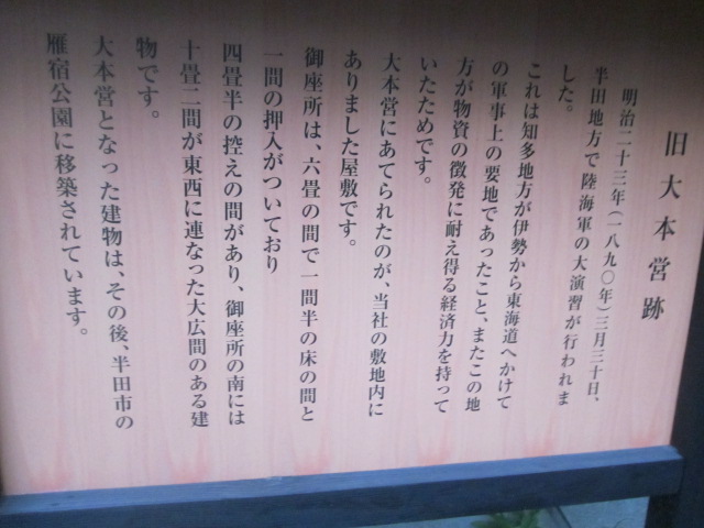 残念ながら、今はこの大本営跡はここでは見られませんが、建物自体は半田市街地の西寄りにある雁宿公園内に移築保存されているそうですので、お時間がありましたら、こちらを見に行かれるのもお勧めだと思います。- 旅行時期