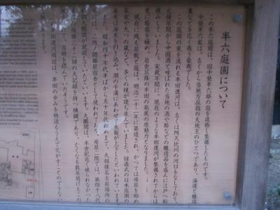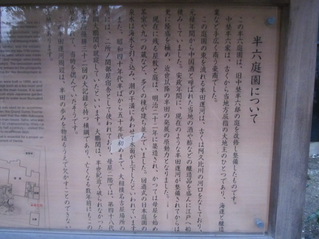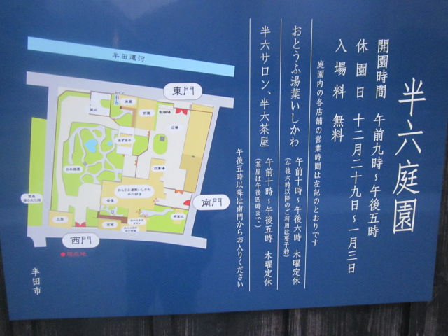 海運業や醸造業で膨大な富を築いた中埜半六家の邸宅を囲むようにして立地している庭園で、かつては、「潮入りの庭」として、半田運河の潮の満干に応じて、水面の変化を楽しめるようなデザインになっているそうです。入口は西・東・南と三か所にあって、観光客的にはどの方角から訪れても、入口のために遠回りさせられる、ということは少なくて、ストレスを感じないのが良かったです。何よりも入場無料というのが、貧民観光客には有難い要素で、私は閉園間際の16時半過ぎに訪れたということもあって、静かな庭園内をしみじみと散策することが出来て良かったです。