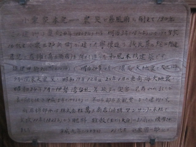 ただ、ここの建物入口脇には、手書きで記された小栗家住宅に関する案内板があって、濃尾大地震や伊勢湾台風などの大災害の際にも、耐え抜いた建築であることなどが誇らしげに綴られているのが良かったです。こういう旧宅には、よく建物の鄙びた風情に似つかわしくない新しい解説板などが設置されていて、少し目障りに思うこともあるのですが、それはここでは全く感じられず、周囲の景観に配慮した、プロフェッショナルな解説板だなと感動しました。- 旅行時期