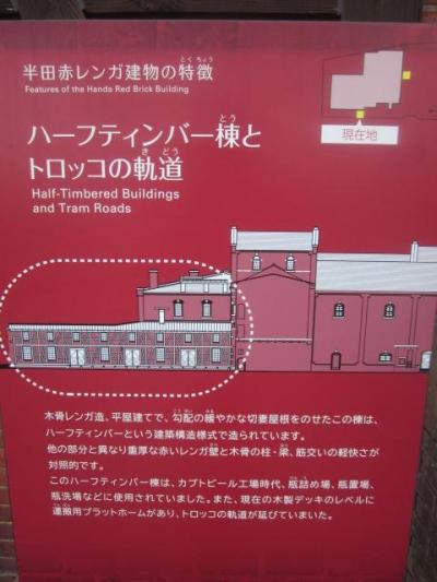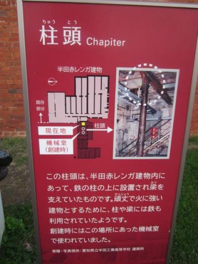 半田を代表する観光地として、まず覚えておかれると良いのがこちらの赤レンガ建物です。立地的には名鉄の住吉町駅が一番近いですが、名鉄知多半田駅から、紺屋海道等を経由してアクセスし、古い街並みを堪能しながら徐々に観光のテイストを強めていって、紺屋海道の北端付近の歩道橋から、目の前にこの立派な建造物がドーンと現れる流れの方が、よりテンションが上がると思います。