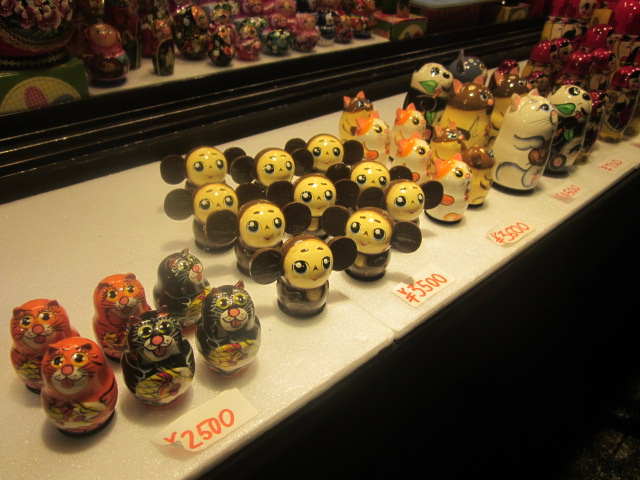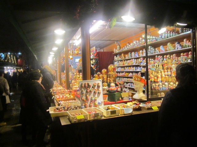 個人的にはここで毎年出店しているロシアのマトリョーシカ屋さんのロシア人とお話しするのが好きなので、毎年訪れていますが、今回は、複数店舗が出店していて、その人気ぶりが伺えました。1軒目に訪れたマトリョーシカ屋さんのお姉さんは、ロシア語で話しかけると案外ぶっきらぼうな対応でしたが、二軒目のお兄さんはとてもフレンドリーで、カエルのマトリョーシカはあるか尋ねてみると、幾つかあるよと、中身も丁寧に開いて見せてくれました。ただ、お値段が高くて買えない、と嘆いていると、”イェショー・プリハジーチエ”(また来て下さいね。)って、仰って下さり、凄く寂しそうなお顔で見送られたのがちょっと切ない気もちになりました。勿論、日本語は普通に通じますが、ロシア語を話すと凄く喜んでくれる(人にもよるけど)方が多いので、同じように、ドイツ語が得意な方などは、是非ドイツ系のお店ではドイツ語で話しかけてみるなど、積極的に国際交流を楽しんでみて下さい。- 旅行時期