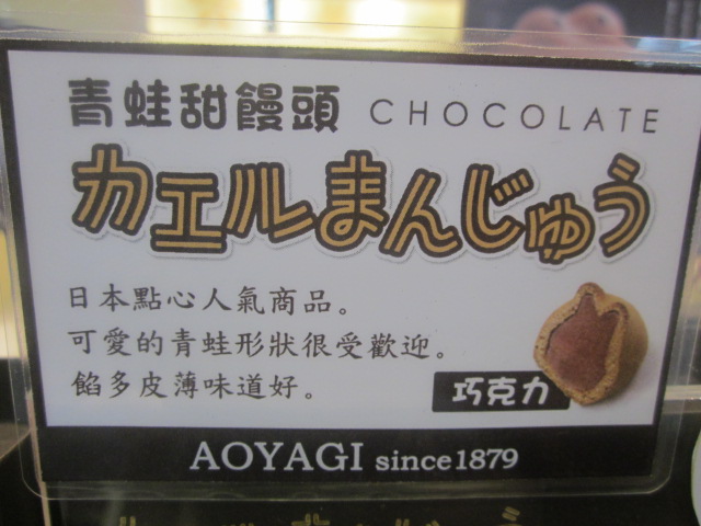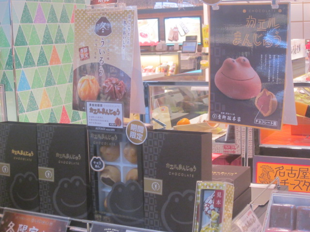 個人的には、ここを訪れる度にかなりの頻度で購入しているのが青柳総本家さんのカエルまんじゅうですが、今回は季節限定のチョコ味カエルまんじゅうが、主役級の扱いで宣伝されていて、このカエルまんじゅうに関しては、箱も少し高級感のあるセントレア特別仕様だとの説明を頂きました。また私に説明して下さったスタッフの方は、最近の通常バージョンのカエルまんじゅうのデザイン変更のことなども詳しくご存じで、カエルマニアとしてはとても嬉しい気もちになりました。以前、外箱の裏面がお面として活用できるデザインになっていましたが、今は通常の通年販売のこしあんバージョンのカエルまんじゅうも、他の季節限定カエルまんじゅうと同様、ペーパークラフト仕様に変更されていますのでご注意下さい。