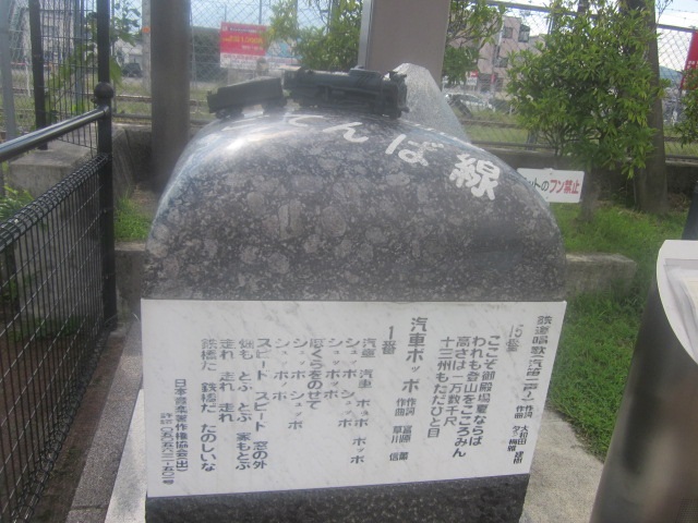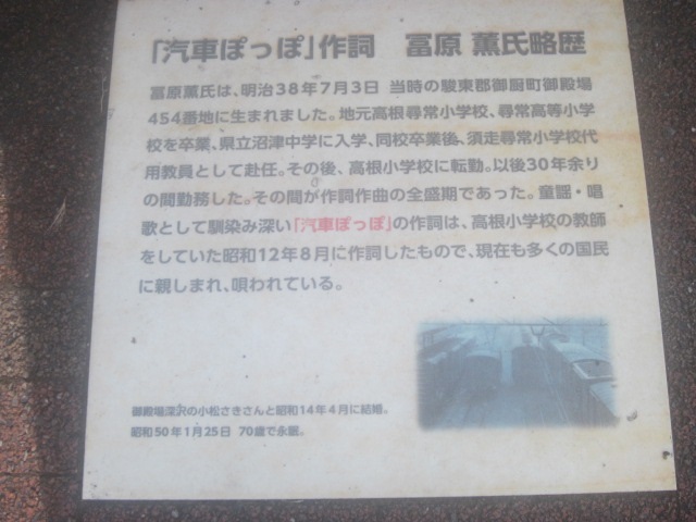 JR御殿場駅富士山口向かって左手にある小さな広場ですが、かつて沿線で活躍していたSLのD5272車両が保存されていて、御殿場線に乗車された際は、車窓からも眺めることが出来ます。勿論SLも見応えがありますが、入口手前には”汽車ポッポ”の歌詞と、御殿場の地名が登場する鉄道唱歌の15番歌詞が刻まれた碑もあって、上部に可愛らしい汽車ポッポが躍動している姿がステキなので、こちらも是非ご覧になってみて下さい。因みに、「汽車ポッポ」を作詞された方が御殿場出身の方なんだそうです。