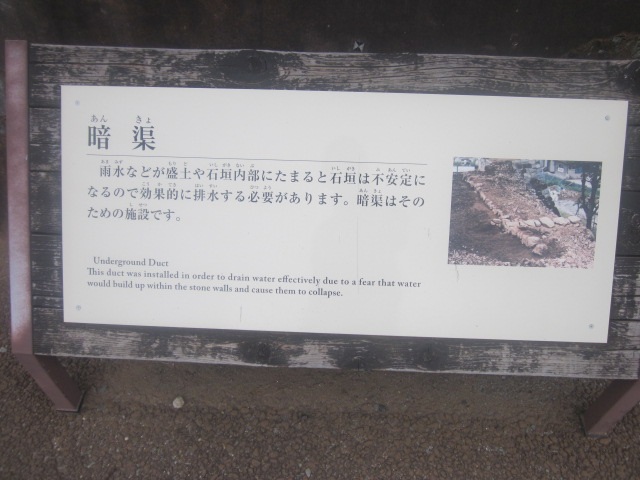 甲府城跡にある遺構の中でも、ここはちょっとマニアックな風情で、排水路を確保していた当時の城建築の技術を感じることが出来る、なかなかシブいスポットです。まあ、設置当時の意義とは別に、現代の観光客的視点からは、ここは天守台と同様、少し高台になっていて、歩きやすいように整備されていますので、景色を楽しんだり、人が多い際は天守台の混雑を避けて、ゆっくり過ごしたりするのに良い場所だと思います。