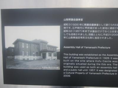 JR甲府駅南口からは駅前通りを直進して徒歩5分位の左手に見える建造物です。外観が立派な如何にも歴史的建造物という風情なので、すぐにそれと判るかと思います。普段は内部公開されていない様子なのが残念ですが、入口位は見せてもらうことが出来ます。隣の別館の建造物と共に、山梨県指定有形文化財となっていますので、外観だけでも見る価値が高いと思います。付近がちょっとした公園のように整備されていますので、お天気が良ければ、この建物を眺めながらのランチ、なんて過ごし方も良いでしょう。
