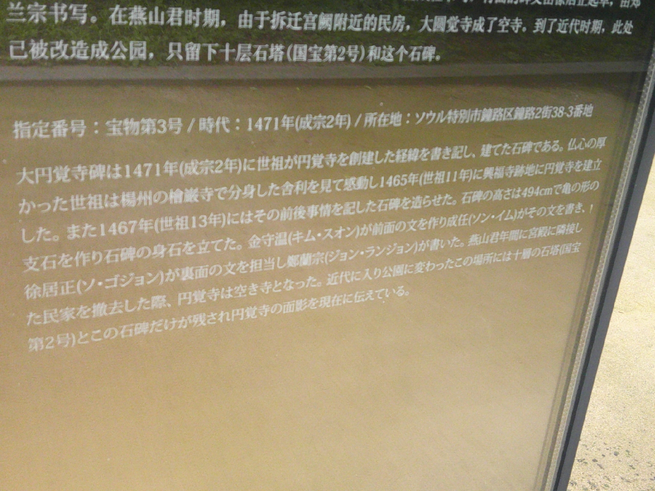 韓国が誇る国宝として、こちらは必見だと思いますが、いつだったか、ガラスケースで覆われるようになってからは、観光用の撮影が難しくなり、仕方がないことなのかもしれませんが、反射を気にしないで撮ることができるような方策はないものか、ストレスを感じておりました。
