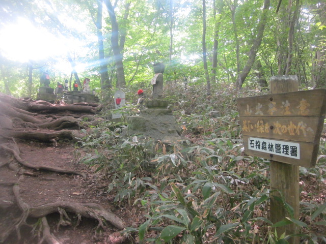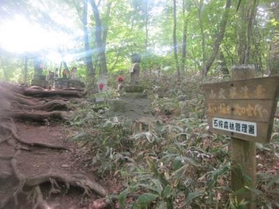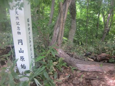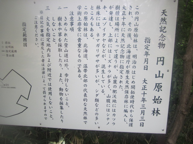 円山登山道の入口には、天然記念物を示す立派な石碑が設置されていますので、それが一番だと思いますが、せっかくなら、円山に登頂しないと見られない標識というのも撮っておきたいものです。頂上直下には、それがあって、近くに原始林に関する解説板も設置されているのですが、今回は笹に覆われて、少し見辛くなっていました。