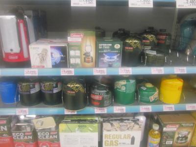 準地元民として、道内でも一番利用頻度の多いホーマック店舗なだけに、商品在庫に関しては、経年的な変化を感じることがありますが、今回、利用して感じたのは、ガスカートリッジの種類が豊富になったことです。以前はメーカーも二社ほど、サイズもあまりなかったように感じますが、今回確認してみると、メーカーも4社ほど扱っていて、夏の販売なのに、寒冷地仕様対応のカートリッジまで販売されていました。