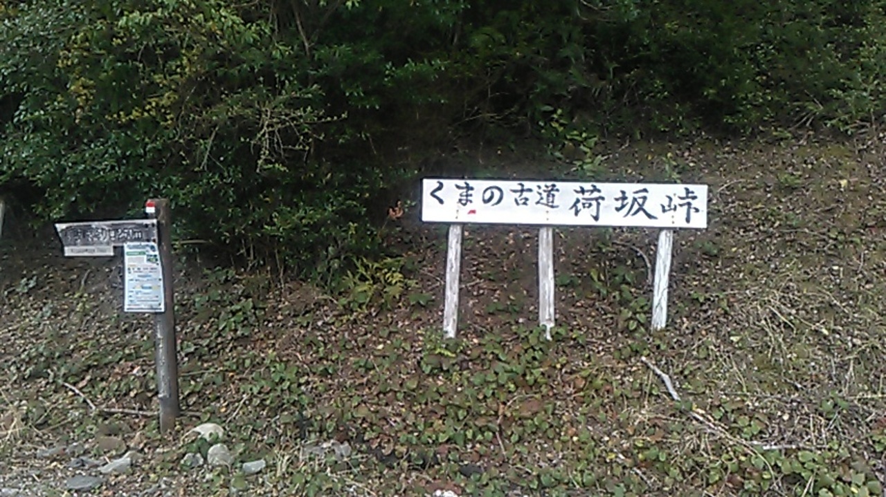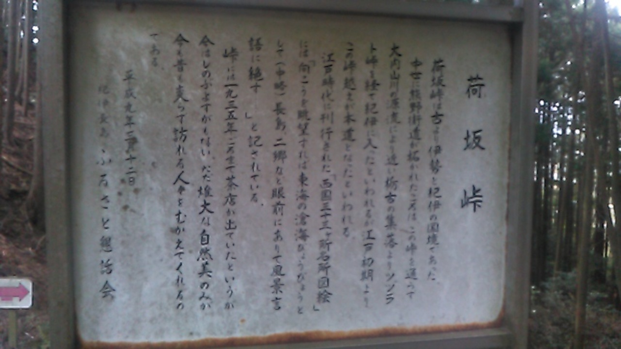 国道42号線の荷坂峠下、紀伊長島側にあります。周囲は森の中ですが、荷坂トンネル手前の裏道から、熊野古道の世界遺産エリアに指定されている旧道を少し下ると、沖見台と呼ばれる展望スポットがあり、ここからだと、遥か彼方に海が望めます。