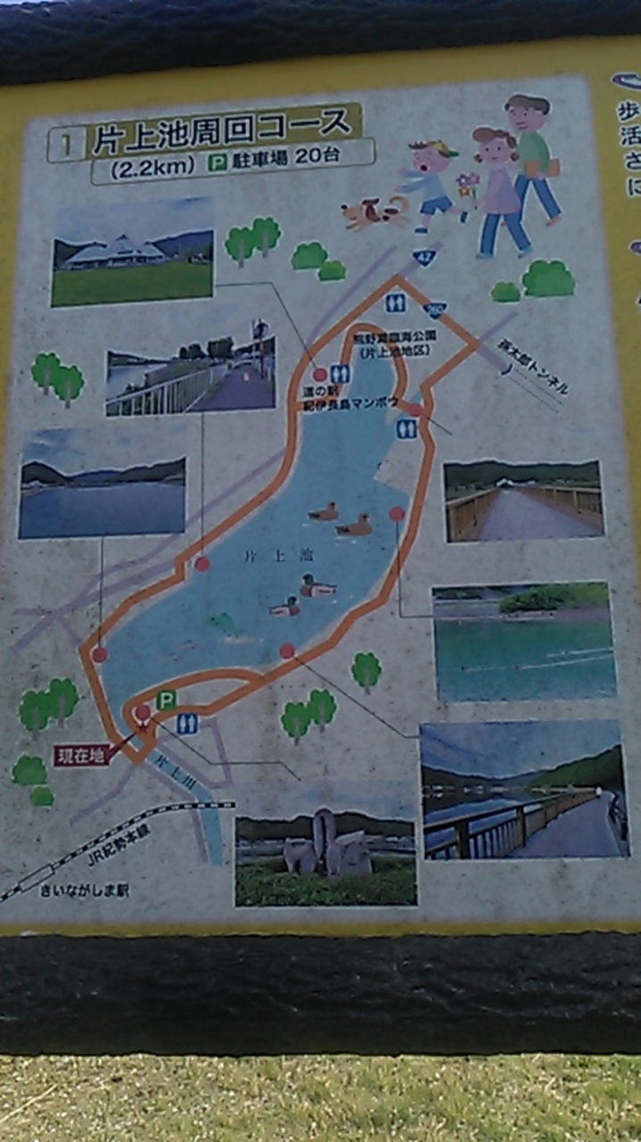 東西に細長い形状の池で、紀伊長島駅に一番近い南西側の萩原台公園までは、駅から徒歩5分程度の近距離ですが、一番遠い北東側にある道の駅までは、駅から徒歩20分位かかります。