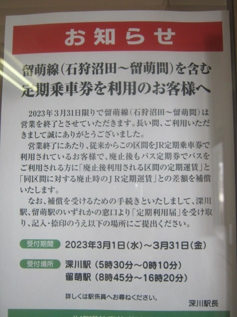 ラストラン時はやはり混雑したようでしたが、第1弾廃止の増毛〜留萌間の時と同様、廃止後はひっそりとした雰囲気で、この日も深川から終点の石狩沼田まで乗車していたのは、ほぼ鉄道マニアのみの4人だけでした。