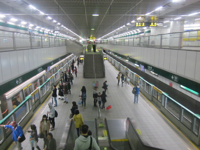現在の台北の都市交通MRT内の各駅は、殆どがホームドア設置となっていますが、今後どうなるかは解らないという前提の上で、2018年1月現在で、まだこの駅はホームドアが未設置で、都心部と比較すると乗降客も少ないので、列車撮影にとてもお勧めの駅だと思います。ただ、その分、監視員の目が厳しいので、決して列車到着前後以外は、ホームに示された黄色のラインより前方に立ち入らないようにご注意下さい。(一歩でも踏み出すと、笛を鳴らして注意されます。)ただ、撮影に関しては非常に寛容なので、その辺は、中国本土と比較すると緊張せずに済むのが良いです。