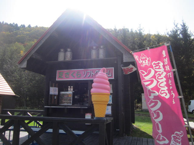 今回は秋に滝上町を訪問しましたので、この町の顔ともいえる芝桜の開花の様子は見られませんでしたが、この道の駅では、名物の一つとして芝ざくらソフトクリームというのを販売していてこれだと花のシーズン以外でも販売されているので、話のタネに良いかなと思います。価格は一つ300円、味はまあ、普通でした。