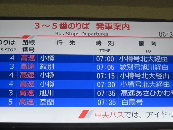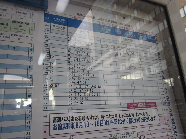 注意したいのは、札幌から乗車する際、北大経由は大通の中央バスターミナルからとなりますが、円山経由は駅前ターミナル発着で、中央バスターミナルは経由しませんので、時計台前などのバス停を利用する必要があります。(ややこしいのは、北大経由便に関しては、駅前バスターミナルも経由します。)