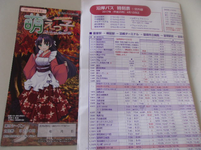 現状の北海道内のバス会社の中では、個人的に一番気に入っているのがこちらの沿岸バスです。まず、本社が羽幌町にある、というのもシブいですが、道北日本海沿いの一連の市町村を旅するのにとても便利な、”萌えっこフリー切符”というのを販売していて、これが1日券で2370円(奇しくも青春18きっぷの一回あたりの金額と同じ)、2日券で3290円という、とてもリーズナブルな金額で、しかも通年販売されています。天売・焼尻の離島に渡る方向けには、連続でない2日日で利用できる、ワイド2日券というのも同じ金額で販売されていますし、この切符を提示するとフェリー代も一割引きになる特典もあります。