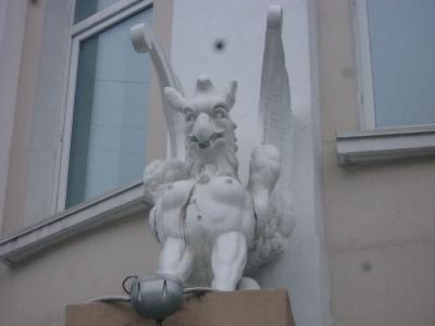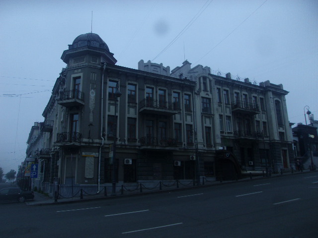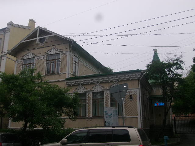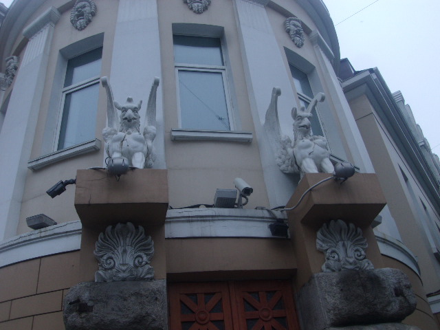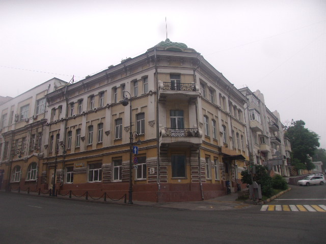 中央広場から北に向かって登り坂で続くオケアンスキー通り沿いにある、ウラジオストクを代表する洋風建築の一つです。ここは何よりも、ポーチ部分の羽が生えたユニークなデザインの動物みたいなのや、獅子の顔、マヤ文明をも彷彿とさせてくれるような彫刻など、細部彫刻のデザインがとても優れていますので、是非ズームしてご覧になってみて下さい。