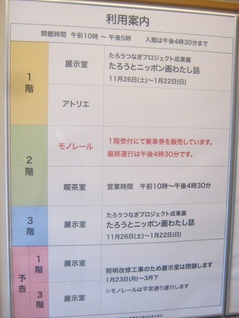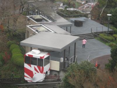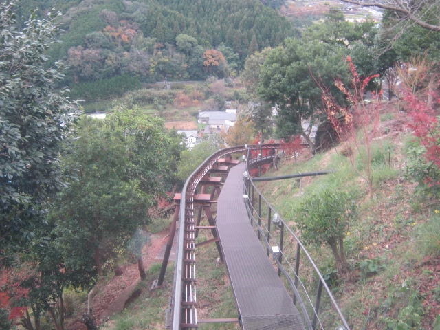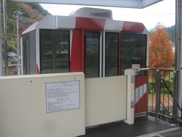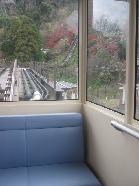 ここのモノレールは、特にタイムスケジュールに従って運行されている訳ではなく、お客さんが来る度に随時運行、のスタイルなので、他の利用者が重ならない限りは、つなぎ美術館の2Fに行けば、すぐに乗車することが出来ます。往復で300円という料金設定ですが、実は片道でも利用できるそうで、例えば、上りは歩きで下りはモノレールといった場合は、頂上のモノレール到着地点に設置されている電話から呼び出すシステムとなっています。