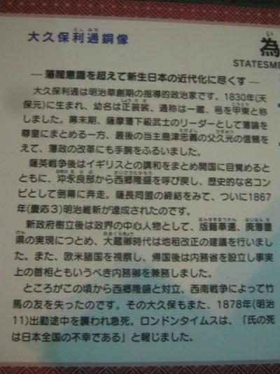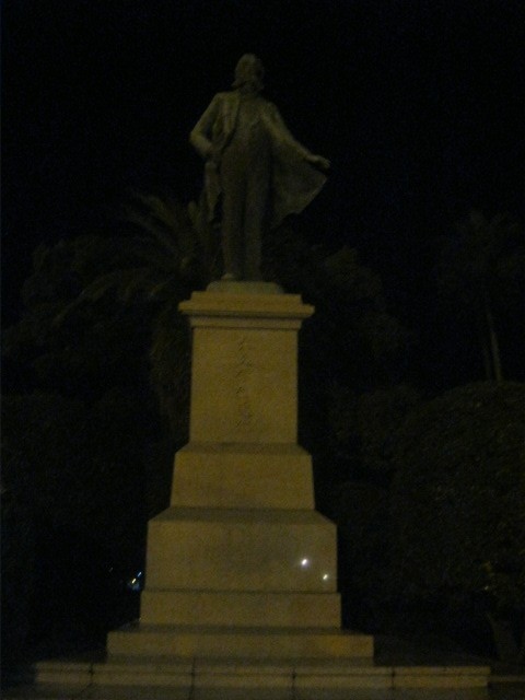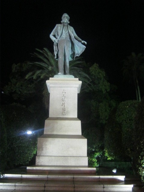 鹿児島中央駅から天文館方面に向かう途中、高見橋を渡ってすぐ左手に建っているのがこちらの像です。暗い時間帯でも、比較的遅くまでライトアップされていますが、今回は、往路はライトアップされた姿を、復路はまだ暗い中でライトアップされていない姿を比較して楽しむことが出来ました。