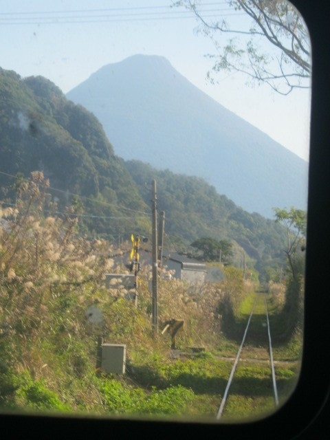 そして、昼過ぎに枕崎をJRで出発し、今度はまず車窓から開聞岳を楽しみましたが、指宿枕崎線の車両の窓はちょっと汚れていて、撮影には不向きかなと思う一方で、進行方向の運転士さんが眺める窓は流石にきちんと拭かれているので、線路越しに眺める開聞岳の姿などを撮るのが車内からはよりお勧めだと思います。