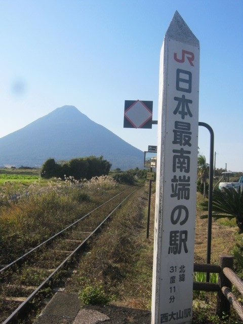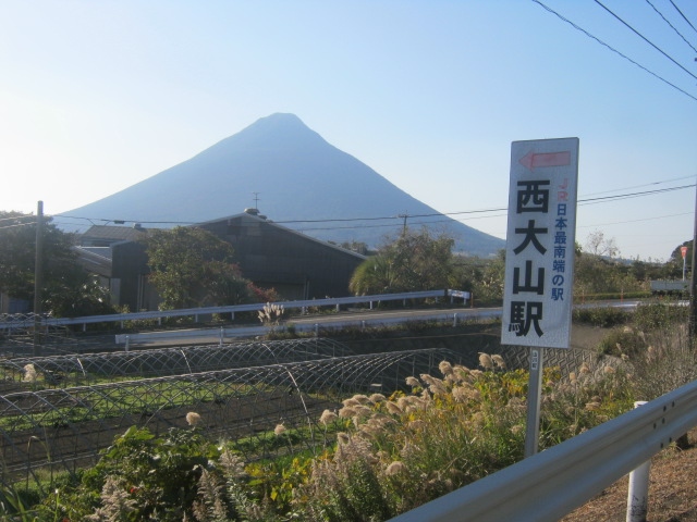 そして、有名なJR日本最南端駅の西大山駅で下車し、ここからの開聞岳の姿を楽しみましたが、この風景は超有名なので、斬新さという意味ではちょっと欠けるかもしれませんね。但し、その後私は山川駅に向かって歩き始めたのですが、その道路上から望む開聞岳の姿もまた素晴らしかったです。