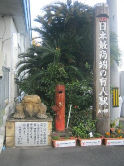 私は最後は時刻表の都合上、西大山駅から山川駅まで歩くことにしましたが、その途中の風景が素晴らしくて、案外歩きもありかなと感動しました。そして、最後はちょっとだけバスに乗って山川駅に到着。ここは日本最南端のJR有人駅ということになるのですが、それを示す標柱の傍でカエルさんが出むカエルてくれたのが嬉しかったです。