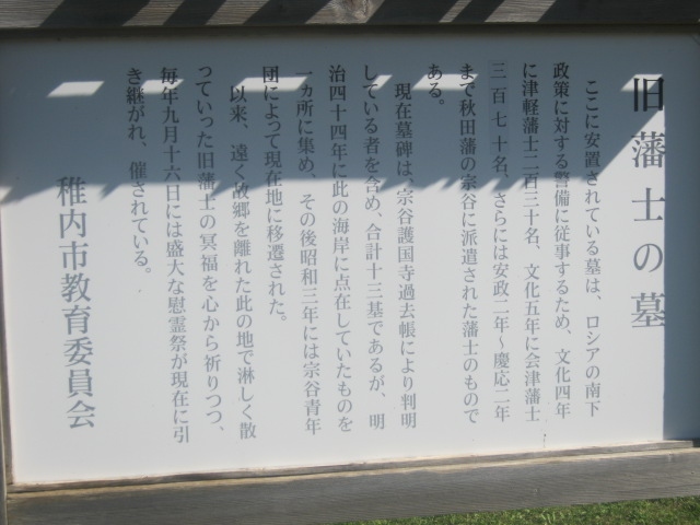 宗谷公園内の一角、宗谷厳島神社から奥に進んだ場所に、元々はロシアの脅威に対抗するために北方警備のために動員された東北地方四藩の藩士達の墓が集められた場所があります。