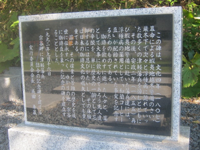 ここに面白い記念碑が一基建っていて、コーヒー豆の形をしているので何かな、と近づいてみると、津軽藩士に配給された、浮腫病の薬用としての和蘭コーヒーが、日本における珈琲文化の普及に貢献したことを記念した碑だそうで、コーヒー好きとしては、いつも普通に美味しいコーヒーを頂けるのは有難いことだな、と、こちらにも合掌させて頂きました。- 旅行時期