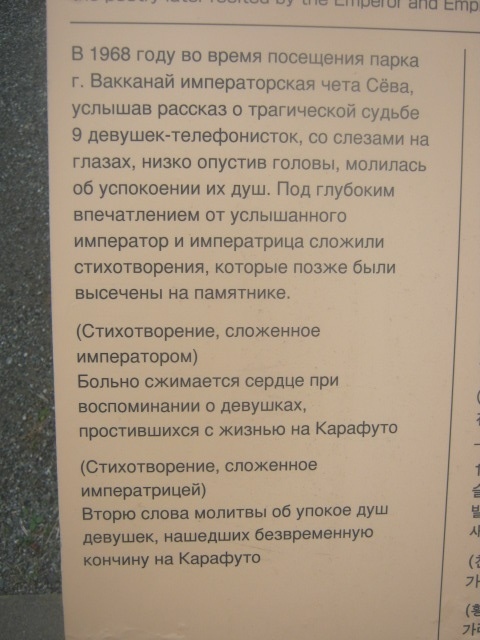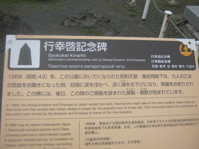 思うに、九人の乙女の悲劇に関して、ロシアの方にも伝えたい思いがあるからこの解説文なんだろうな、なんて思うにつれ、今現在、肝心のロシア人が日本になかなか来るのが難しい現状をもどかしくも感じてしまいました。- 旅行時期