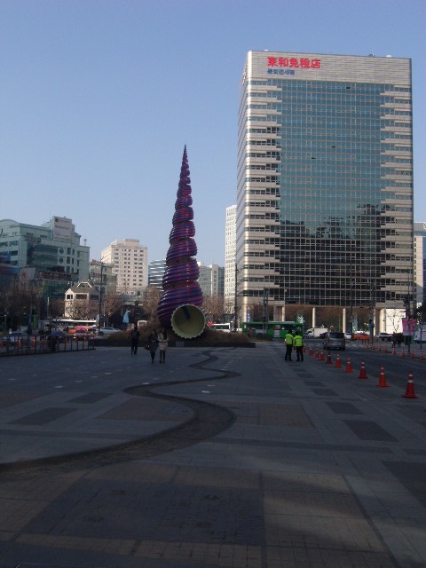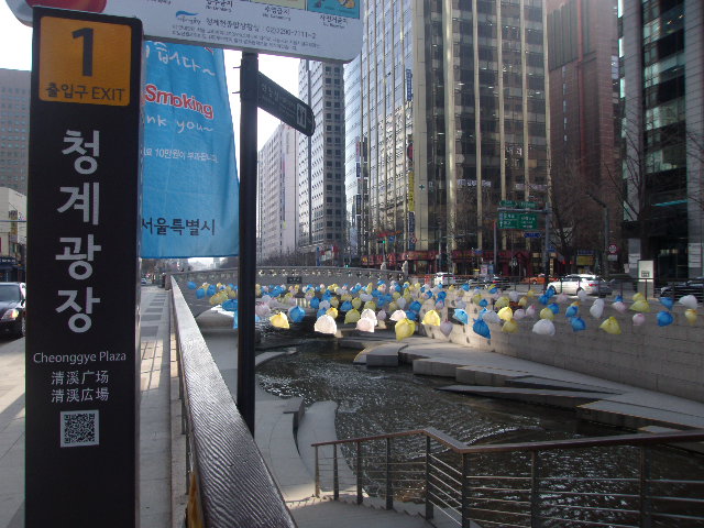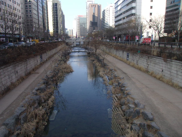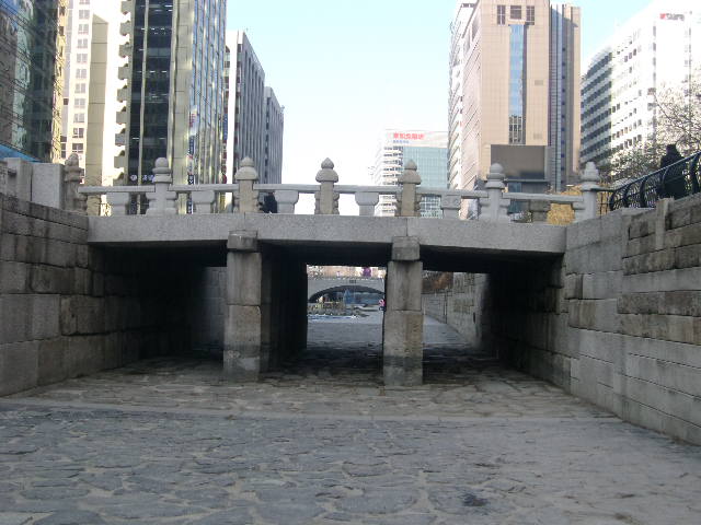 こちらに関しては、清渓川沿いの橋の中でも鍾路エリアと明洞エリアとを繋ぐ交通の要衝に架かる、文字通り幅の広い橋です。ここから眺める清渓川の様子は、川の長さを全体として捉えることが出来ますので、よくガイドブック等にも清渓川の景観として掲載されている風景なので、見覚えがある方も多いのではないでしょうか。清渓川沿いでは、橋の袂でよくWifiが使える旨の看板が設置されていますが、ここは特に電波状況が良いように感じますので、夏でしたら、心地よい風を感じながらネットサーフィンして過ごすのにも良い場所かと思います。
