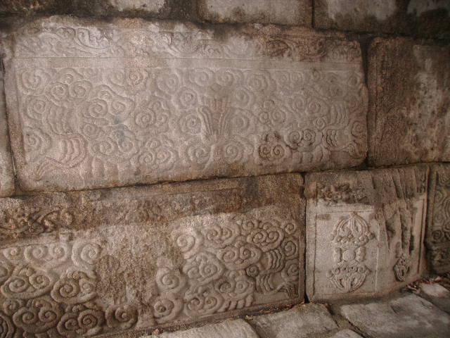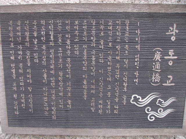 この橋に関しては、実用の橋としての機能よりも、随所に色々な装飾が刻まれていますので、これらの芸術品的な見物スポットとして注目すると良いかと思います。橋の下部の石積みに刻まれたデザインなどを見ていると、中米のマヤ遺跡にでも迷い込んだかのような不思議な感覚を覚えます。デザインの細部の意味について詳細に知りたかったのですが、解説文がハングルしかなく、十分には理解できなかったのが口惜しく感じられました。
