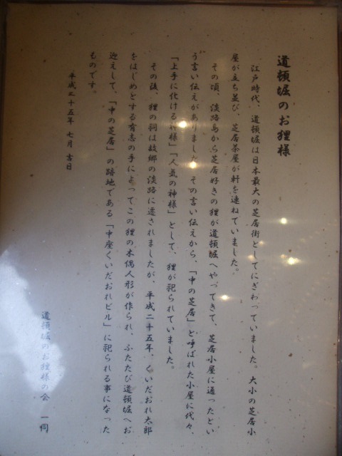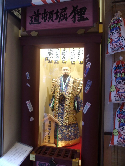 道頓堀の顔として、ここを連想される方も多いかと思います。紆余曲折を経て、ここに落ち着くことになったくいだおれ太郎君は、いつも記念撮影の観光客で賑わっていますが、その横にいらっしゃる道頓堀狸も、なかなかの見応えがあります。ちょっと気付き辛い立ち位置ですが、道頓堀の方々の思いがつまった素敵な狸様なので、是非こちらもお見逃しなく…。