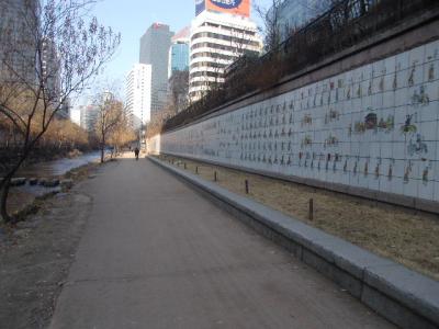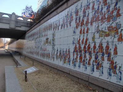 清渓川沿いの長通橋付近に延々と続く壁画がこちらで、細部を丁寧に見ながら歩くとかなり時間がかかるかと思います。所々にその付近の壁画の具体的な行列の内容がハングルと英語で記されている案内板もあって、これらを読みながら進むと更に時間がかかりますが、より造詣が深まって楽しめるかと思います。尚、壁画の始まり部分には、より大きな解説文が壁画そのものに刻まれていますので、進行方向としては、どちらかと言えば西側から歩いて、先にこの長文を読まれてから、以後の行列壁画の細部を眺める方が良いかと思います。