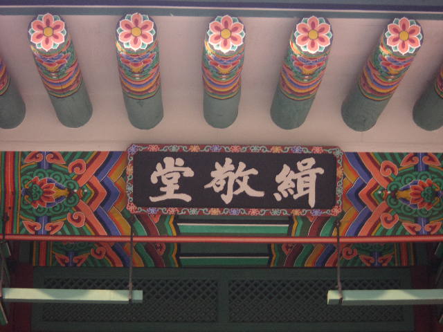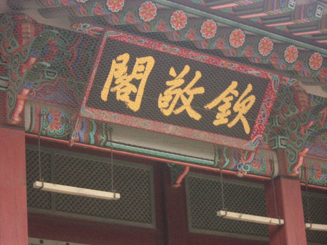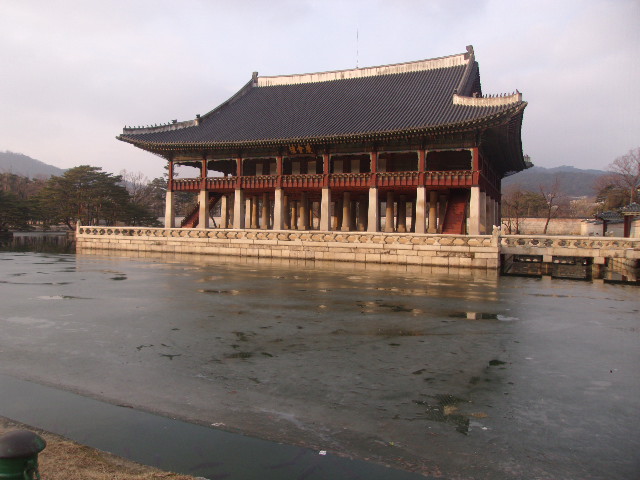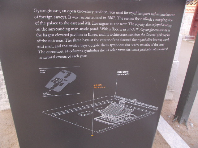 景福宮を代表する景観としてここを連想される方も多いかと思います。簡単に言ってしまえば人工池に浮かぶ二階建の巨大な楼閣のような建造物ですが、韓国最大の高架式木造建築としても知られています。2階部分には三つのフロアがあって、それぞれが天・地・人を、そしてそれを取り囲む12のフロアが12か月を、更に建物を取り囲む24の柱が二十四節気を象徴しているという意味で、東洋哲学の思想が体現された素晴らしい建造物となっています。ここから西側に望める仁旺山の風景もとても美しいので是非お見逃しなく!