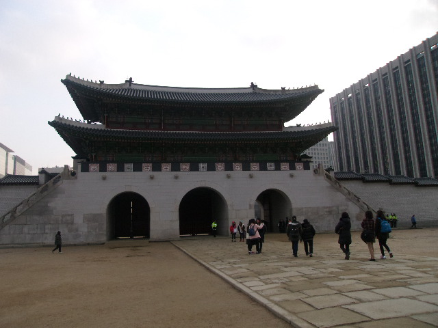 ソウルを代表する門の一つである光化門ですが、この門に関しては南側の光化門広場からの景観のイメージが観光客的には偏向しているように感じます。勿論、南側からの景観も素晴らしいのですが、門自体に注目したい場合、光化門付近は交通量が激しくて、なかなか思うように綺麗な状態で撮影することが難しいように感じます。その反面、景福宮側からは興礼門との間に広がる広い空間を利用して、立体感のある光化門の姿を撮影できます。こちらから見るのは、景福宮の観光帰りという場合が多く、意外と素通りされている感があるのは残念に思います。是非、最後まで観光の集中を切らさず(?)に、反対側からの光化門の姿にも注目してみて下さい。