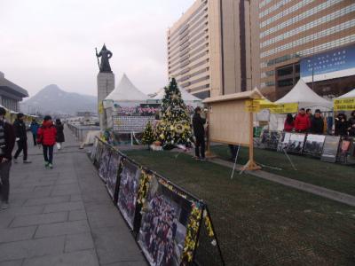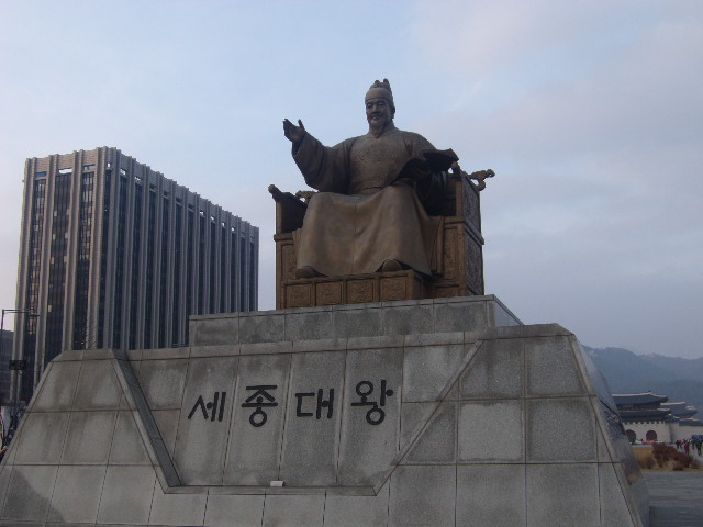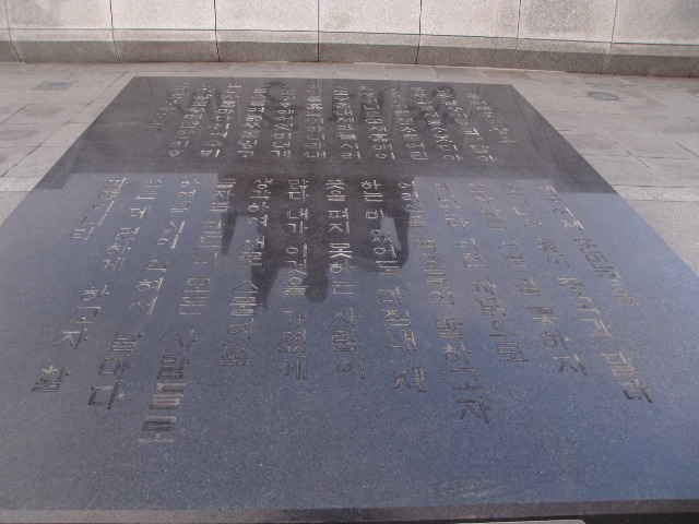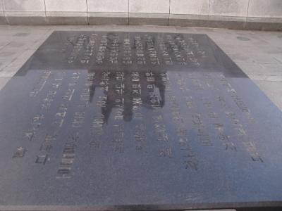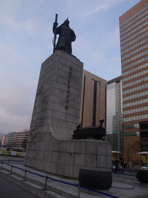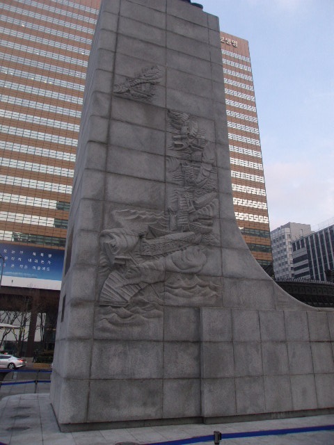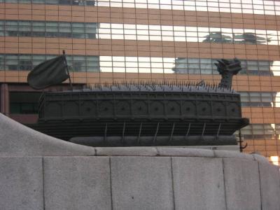 光化門広場の南端で存在感を示しているのが、韓国の英雄の一人として国民に愛されている李舜臣の銅像です。日本史でも登場する人物ですので、日本人にとっても有名な人物かと思いますが、この銅像では人物そのものだけでなく、台座部分の小洒落た演出にも注目して頂きたいです。文禄・慶長の役(韓国側では壬辰・丁酉の倭乱)で活躍した亀甲船そのものの模型が正面に飾られている上、台座側面には、荒海の中を進む亀甲船の場面をモチーフにしたレリーフ画が彫られています。