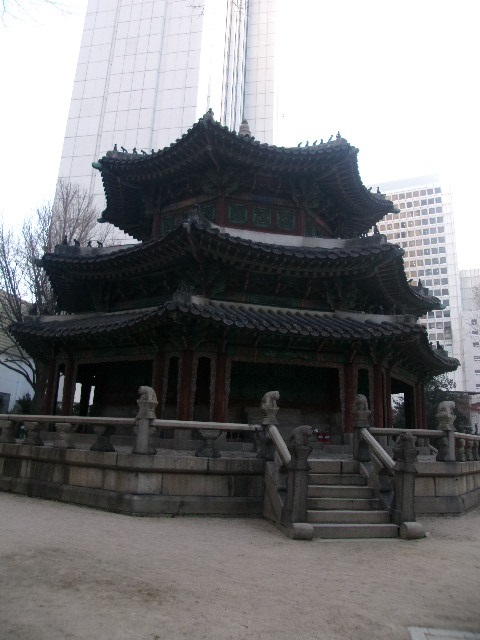 写真でもお馴染みの八角形三層構造の名建造物で、市街地の中心部にありますので、適当に歩いていたら見えるのかなと思って特に考えずにこの付近へと足を運びましたが、ここはちょっと高台の上にあって、意外と直前までこの建物を拝むことができませんでした。私は北西側から階段を登ってアクセスしましたが、どちらかと言えば、南のウェスティン朝鮮ホテル側から登った方が道が判り易いかなという印象を受けました。