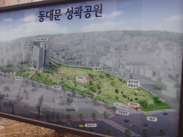 東大門の北西側に城壁沿いに縦長に広がる公園で、城壁までの標高差がありますので、東大門側から城壁を背景にしたダイナミックな景観を楽しむことが出来る公園です。理想としては城壁の東側に遊歩道が駱山公園まで続いていますので、ウォーキングを共に楽しむと良いかと思います。私は駱山公園からずっと遊歩道を下っていきましたが、東側の城壁の一部には刻銘などが見られる箇所もあって、とても情緒がありました。