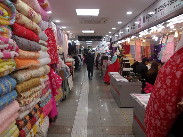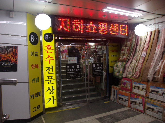 地下鉄東大門駅の地下に広がる敷地面積的には結構広いショッピングセンターですが、入口がちょっと目立たずに数も少ないので、意外と見落としがちな所かもしれません。中に入ってみると、狭い通路上には沢山の毛布やお布団類、チマチョゴリなどに使用されているような生地が並んでいて、色彩豊かな景観が広がっていますので、ビジュアル的に楽しめるショッピングセンターだと思います。