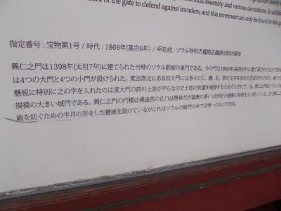 ソウルを代表する門としては、数年前の焼失後、最近になって復元された崇仁門(南大門)が有名かと思いますが、東の代表としてはこちらで、ソウル市民は敬意を持って興仁之門(フンインジモン)と呼ぶ方が多いように感じます。(ただ、現実問題としては、この辺りの一角が東大門として呼ばれているため、狭義の東大門を区別するために、この呼称を用いていることが多いようです。)解説に関しては、他の方や解説板に譲りますが、下部に甕城が築かれた、より城砦都市としての雰囲気を今に伝える雰囲気が素晴らしい、個人的にはソウル市内で一番好きな門です。甕城は元々外敵を防ぐためのものであり、一面にしか築かれていませんので、両側から違いを楽しむと良いかと思います。