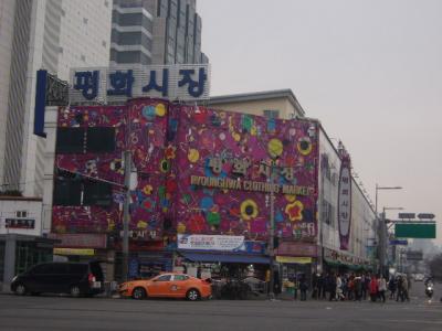 東大門エリアの清渓川沿い、丁度、川を挟んで東大門総合市場の対岸に位置するのがこちらの市場です。ここは下着や一般衣類などの品揃えが豊富でしかも安く買える(ウォン高の影響で、日本人的な感覚からは依然と比較すると相対的に高くは感じますが…)ので、行動着などを手っ取り早く調達するのに良い場所ですが、ここの東側入口が、ユネスコのデザイン創意都市に選定されたという昨今のソウルらしく、従来の市場の入口とは思えない程派手な柄になっていて、是非、交差点の対岸からこの入口の景観を楽しんで頂きたいと思います。